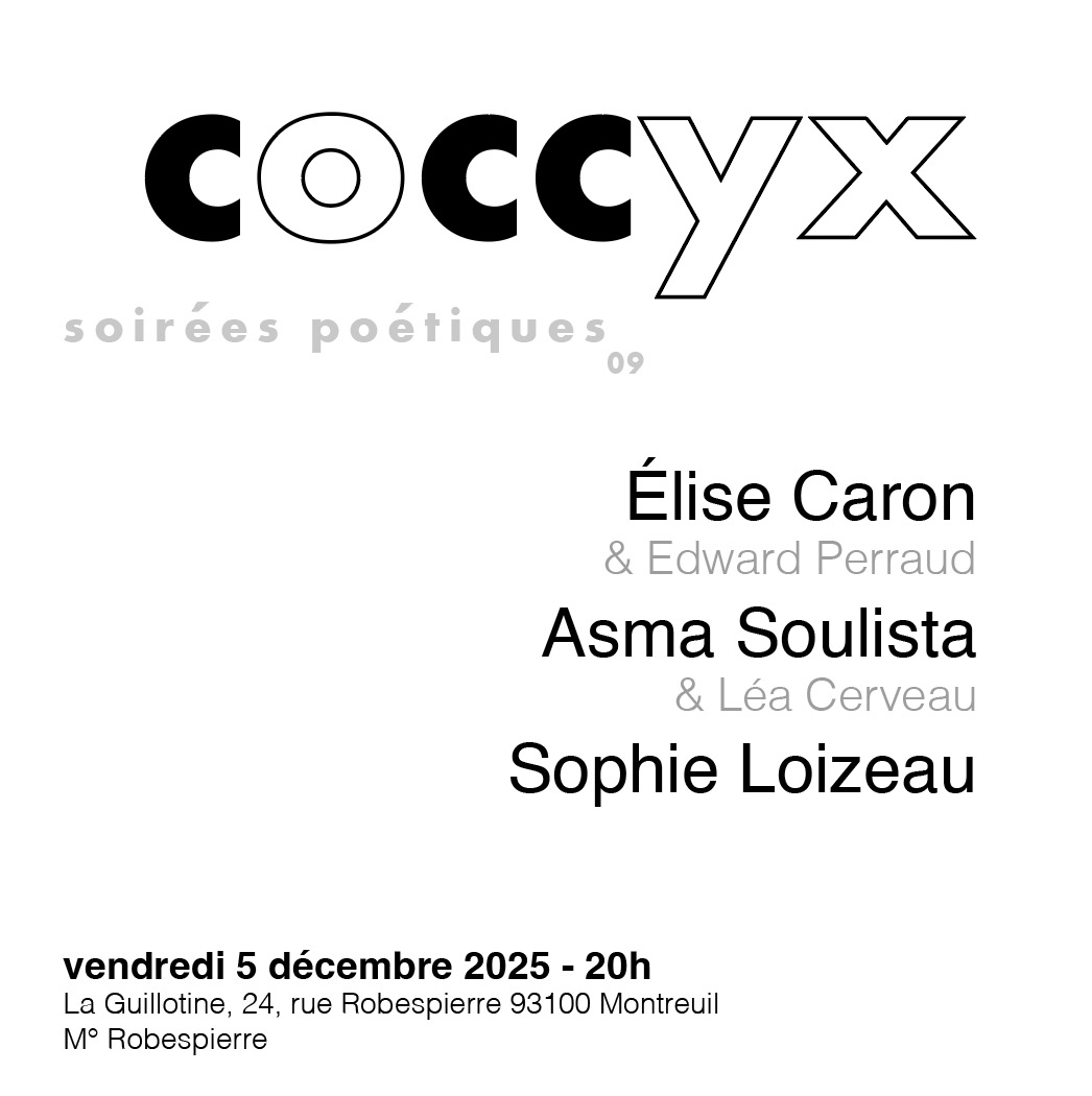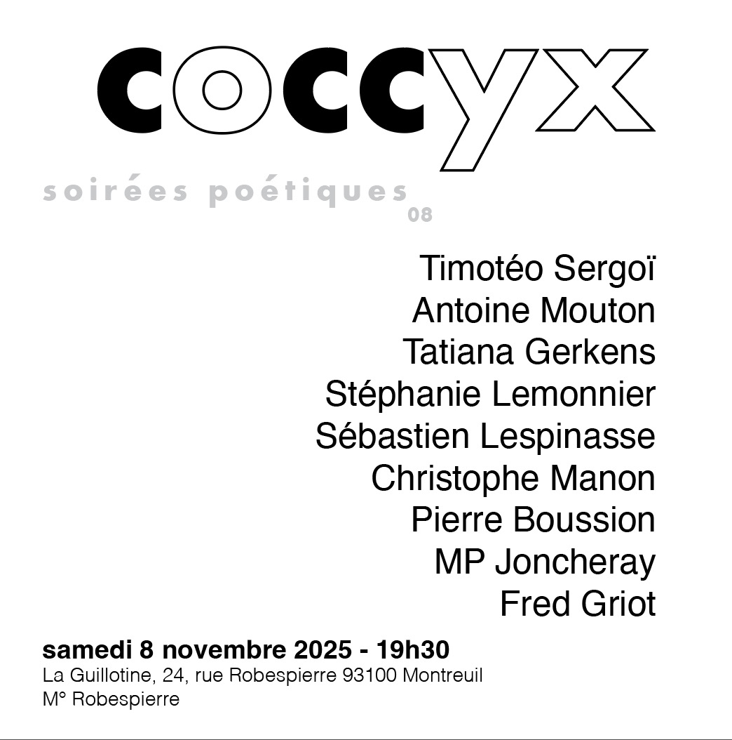 • sam 08 novembre - soirée Coccyx 08 (la Guillotine, Montreuil) Confirmés : Timotéo Sergoï, Tatiana Gerkens, Pierre Boussion, Stéphanie Lemonnier, Sébastien Lespinasse, Antoine Mouton, Marie-Philippe Joncheray, Christophe Manon, Fred Griot