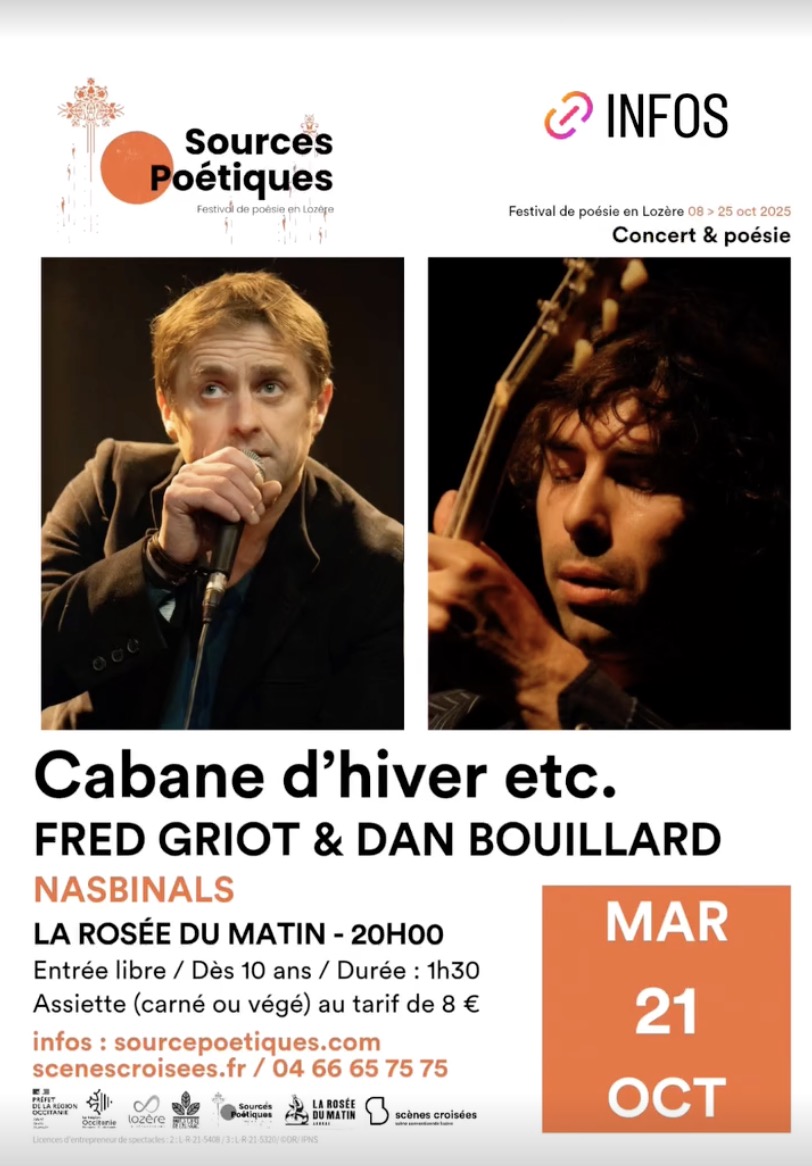 festival Poésie dans les chais 13 sept : lecture solo de cabane d'hiver (21h, Cité des Pyrénées - 29 bis, Rue Berlioz - Pau) 14 sept : solo de parl# (15h, domaine Lapeyre, chapelle de Rousse, 64110 Jurançon) |